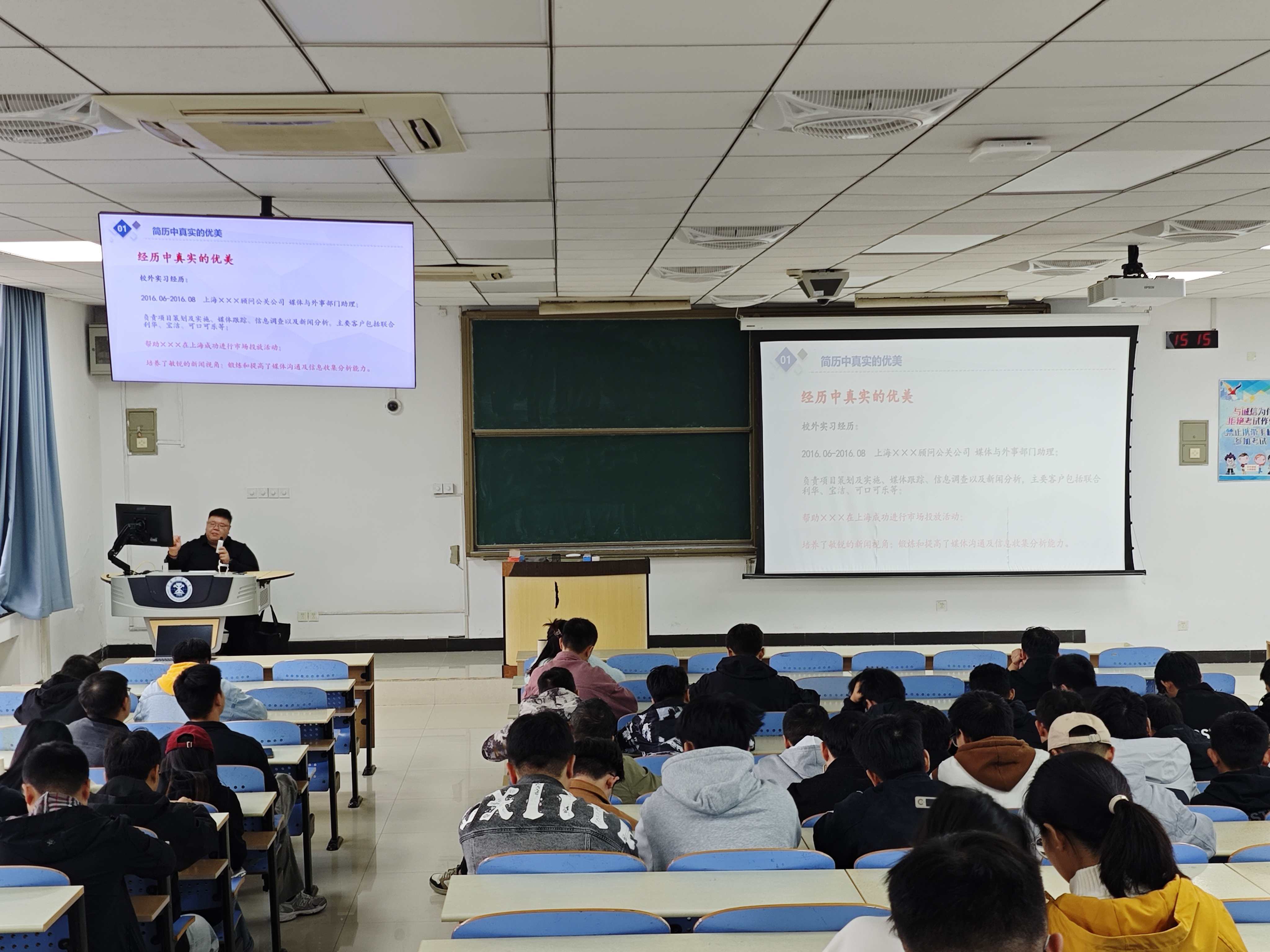 刘世通老师围绕当前就业环境与学院往届毕业生就业情况,系统分析了相关行业的发展趋势与招聘动态,详细介绍了学校与学院为学生提供的就业指导服务体系、信息发布平台及校企合作资源。他从简历撰写、面试技巧、岗位选择等多个方面为同学们提供实用建议,鼓励大家结合专业特长与个人兴趣,尽早明确就业方向,增强求职竞争力,把握秋招、春招等关键时间节点,实现高质量就业。