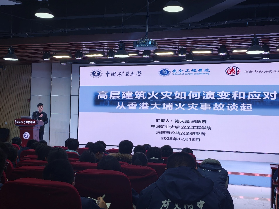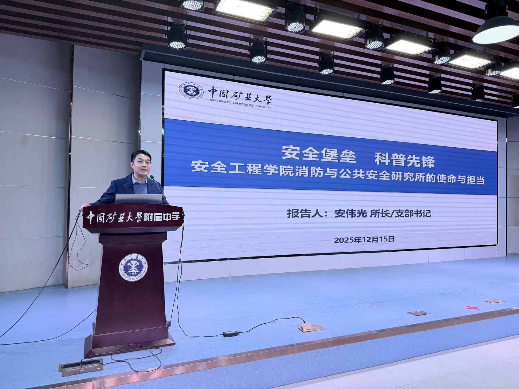 为深化高校党建与基础教育联动,12月15日,学院消防与公共安全研究所党支部以 “共筑防火墙 同育栋梁材” 为主题,组织党员骨干走进中国矿业大学附属中学开展主题党日活动。活动由研究所支部书记、所长安伟光教授带队,褚天巍副教授、焦伟冰副教授共同参与,通过普及消防安全知识、强化灾害防范意识,助力筑牢校园安全防线。中国矿业大学附属中学副校长黄永乔参加此次讲座,高一年级副主任王娜主持本次活动。