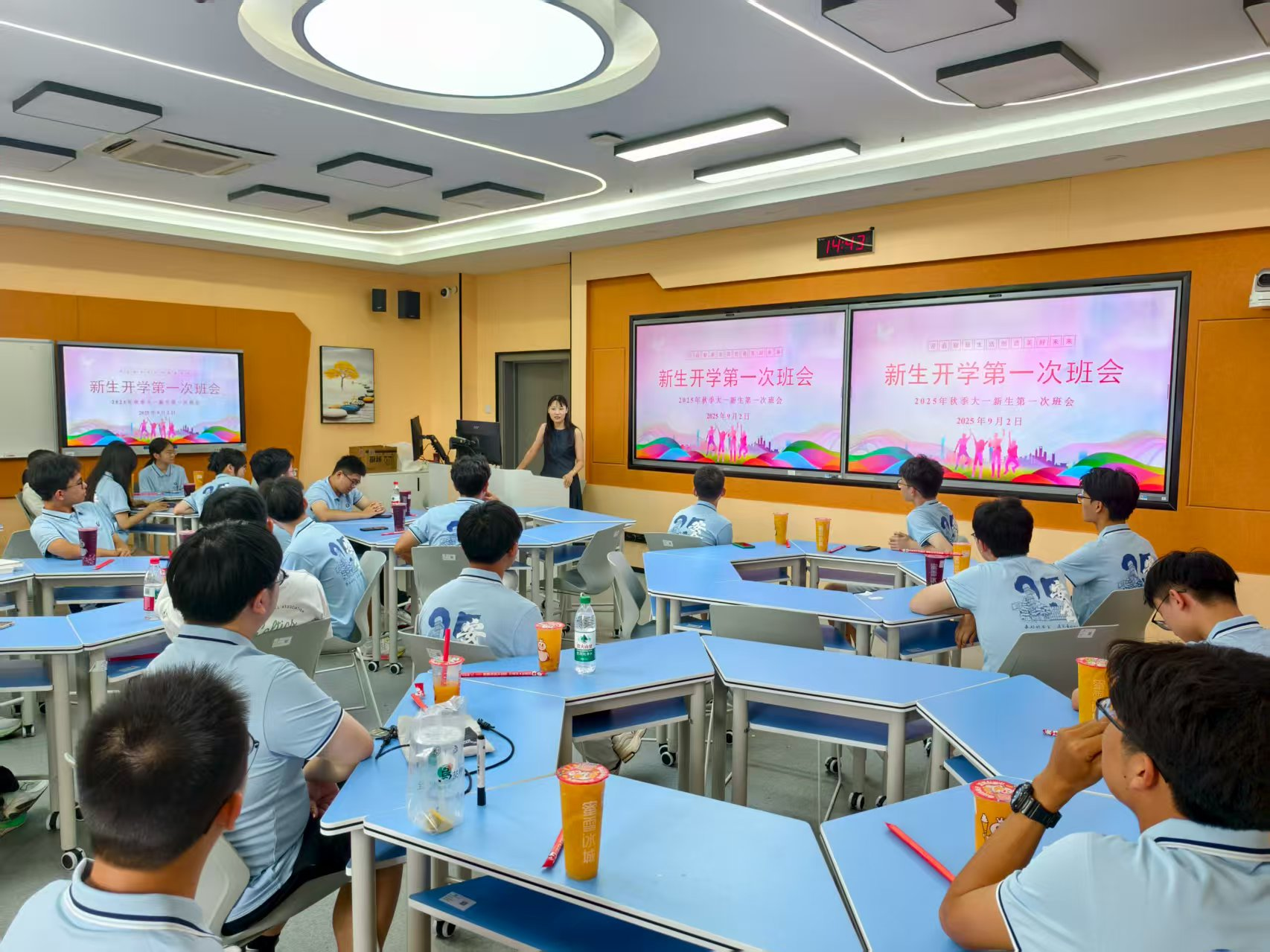 王一涵老师详细介绍了学院的学科特色、发展前景及人才培养目标,着重强调了大学阶段自主学习与独立思考能力的重要性,通过涉及专业课程体系、学习资源、校园生活服务等多方面的讲解,为新同学们清晰描绘了大学生活的整体图景。随后,同学们踊跃登台,分享个人兴趣、家乡特色及对大学生活的憧憬,或幽默风趣引发欢笑,或真诚朴实打动人心,现场气氛活跃热烈。