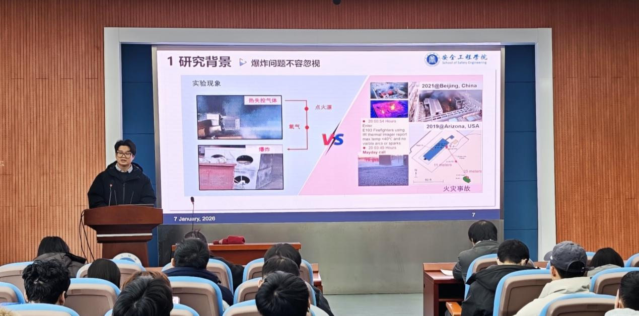 论坛聚焦安全工程前沿研究方向,三位主讲人依次开展学术分享。刘淳元以锂电池火灾防控为核心,分享“泄爆面积与形状对锂电池热失控气体爆炸特性影响研究”成果,详解灾害防治关键技术与实验进展,为新能源安全提供重要理论支撑;骆宇晨围绕职业健康与粉尘治理,结合工程实践与模拟分析,探讨了工业环境中粉尘控制技术的优化路径;邱浩深耕煤层气高效开采与热能利用领域,分享“高温热蒸汽强化煤层气开采及其润湿特性的实验与分子动力学研究”成果,揭示煤体结构演化与气体运移规律,为能源安全开发提供新视角。报告后,嘉宾与同学围绕科研方法、实验设计、成果转化等话题深入交流,共享科研心得。