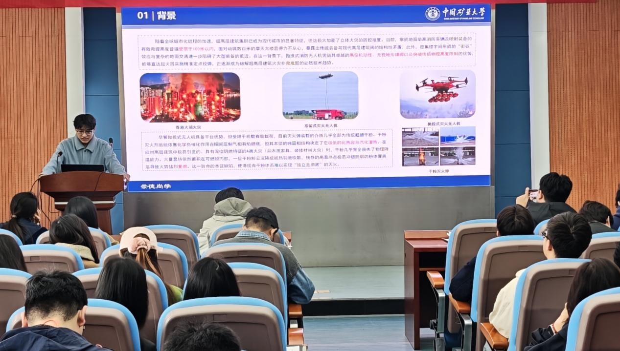 聚焦安全工程前沿研究,三位主讲人依次分享学术成果。张世勇围绕高层建筑无人机灭火救援,介绍了P-Mg复合干水的灭火效能及作用机理;杨腾锐针对水射流破煤与煤与瓦斯流态化共采,阐述了流态化造穴装置的调控机制与参数优化方法;李志仁聚焦煤炭粉尘防治,探究了大豆豆粕基矿用抑尘剂的腐蚀性调控与抑尘性能。报告结束后,嘉宾与同学们围绕科研方法、实验设计及成果转化等话题深入交流,共享科研心得。