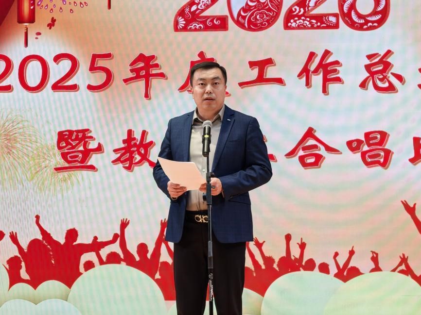 翟成对学院2025年工作进行了总结汇报。他指出,2025年全院上下紧紧围绕立德树人根本任务和“双一流”学科建设核心目标,在学院发展的蓝图上,取得了显著成绩。随后他从学科建设和国际化、师资队伍建设、教育教学和人才培养、科学研究、后勤服务保障等方面做了详细汇报。最后他希望,2026年全体教职工坚守初心,砥砺前行,聚焦内涵发展,奋力书写学院发展新篇章。