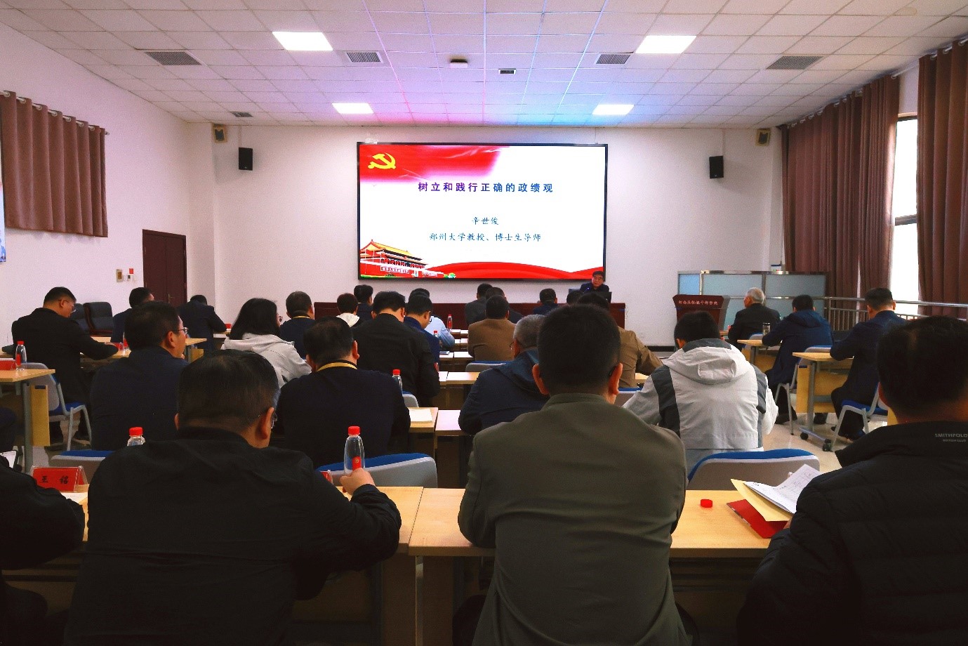 专题授课环节,郑州大学教授辛世俊、焦裕禄干部学院培训教师赵兴国分别作专题报告。辛世俊教授以《树立和践行正确的政绩观》为题,围绕正确政绩观的核心内涵、实践要求,结合新时代高校工作实际,深入解读了共产党人政绩观的人民立场与实践底色;赵兴国老师以《焦裕禄精神的形成与时代价值》为题,通过焦裕禄同志的感人事迹,生动阐释了焦裕禄精神的形成脉络、丰富内涵及其在新时代的传承与发展,引导学员们深刻把握“为民造福是最重要的政绩”的核心要义。